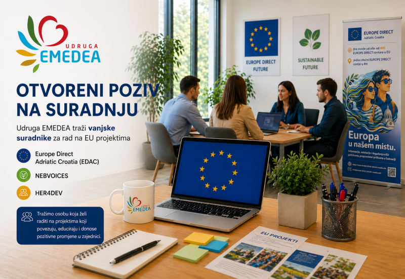 Udruga EMEDEA kontinuirano traži vanjske suradnike za suradnju na provedbi međunarodnih i EU projekata, uključujući Europe Direct Adriatic Croatia (EDAC), NEB Voices i HER4DEV. Radi se o dinamičnom i zahtjevnom angažmanu koji obuhvaća više područja rada, od administracije i sadržaja do organizacije događanja i digitalne komunikacije.